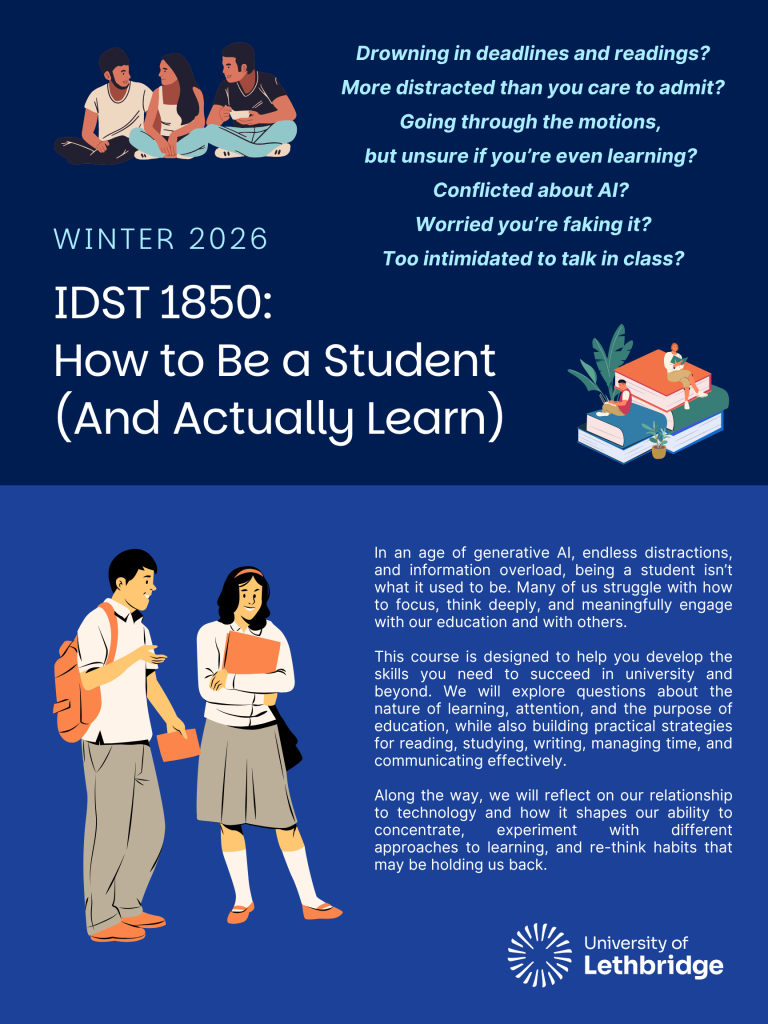 Course description: How do you actually learn in university? In an age of generative AI, endless distractions, and information overload, being a student isn’t what it used to be. Many of us struggle with how to focus, think deeply, and meaningfully engage with our education and with others. This course is designed to help you develop the skills you need to succeed in university and beyond. We will explore questions about the nature of learning, attention, and the purpose of education, while also building practical strategies for reading, studying, writing, managing time, and communicating effectively. Along the way, we will reflect on our relationship to technology and how it shapes our ability to concentrate, experiment with different approaches to learning, and re-think habits that may be holding us back.
