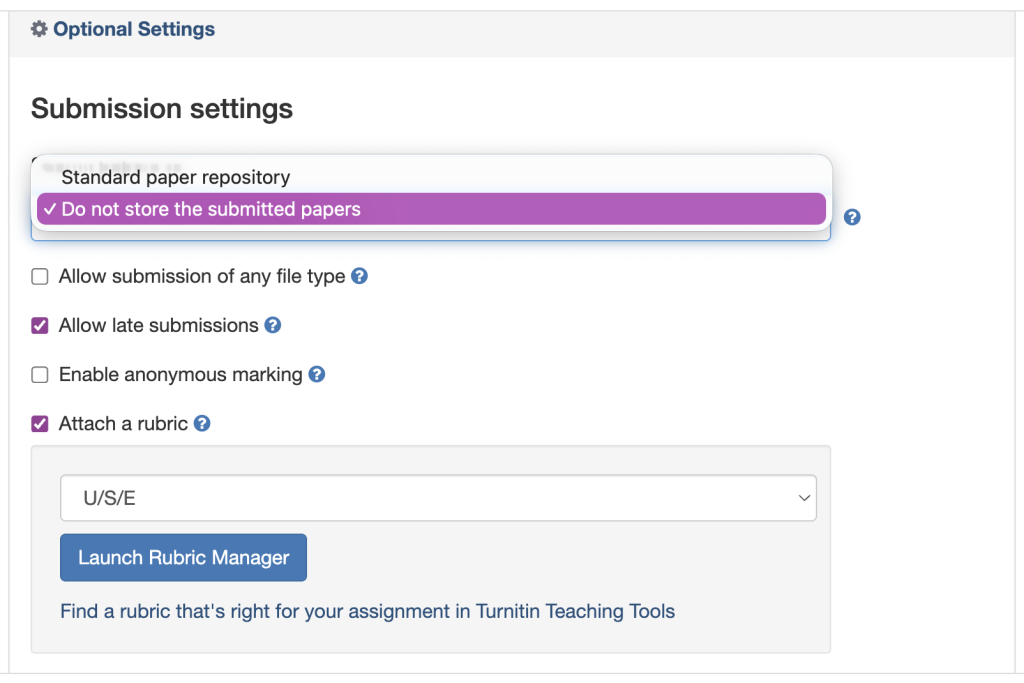 • Similarity Report: Decide whether students can see their reports and whether you want to exclude small matches or bibliographies.