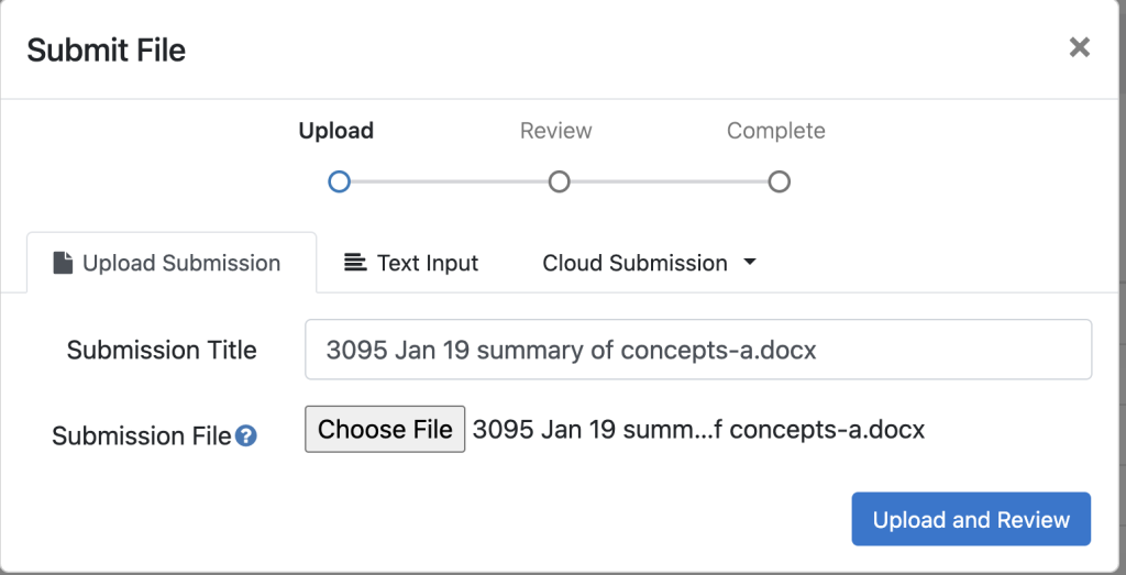 Choose a file to upload, or copy and paste text. Click Upload and Review.