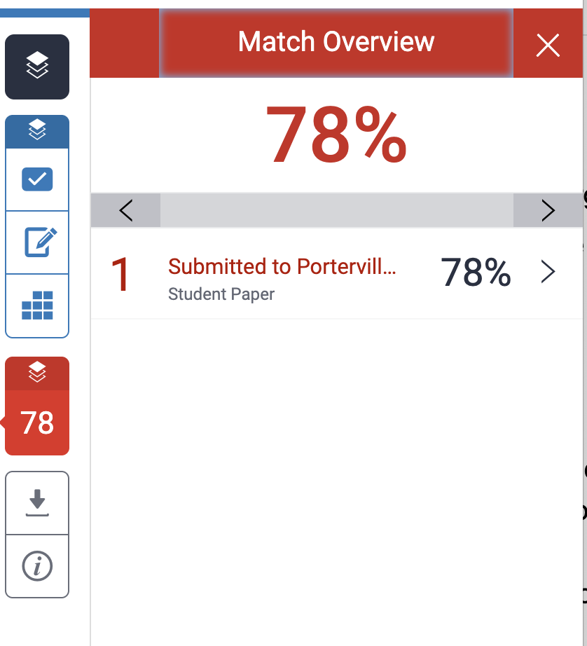 • Navigation Arrows: Use the < and > arrows on a source card to jump directly to each instance of that match within the student's paper.